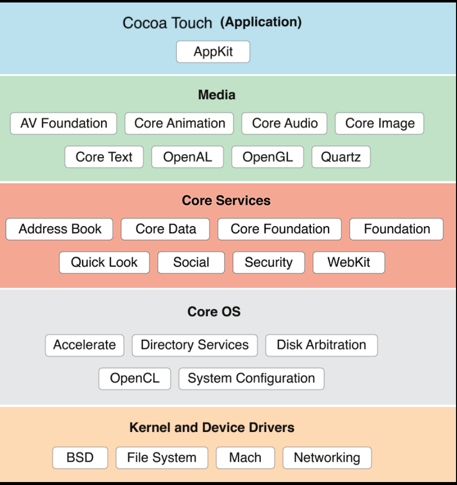 iOS Architecture consists of four distinct layers Cocoa Touch, Media, Core Service and Core OS; The hierarchy describes in the below image for iOS.