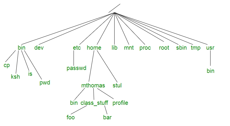 The Unix files system hierarchy is explained below with a reference image.